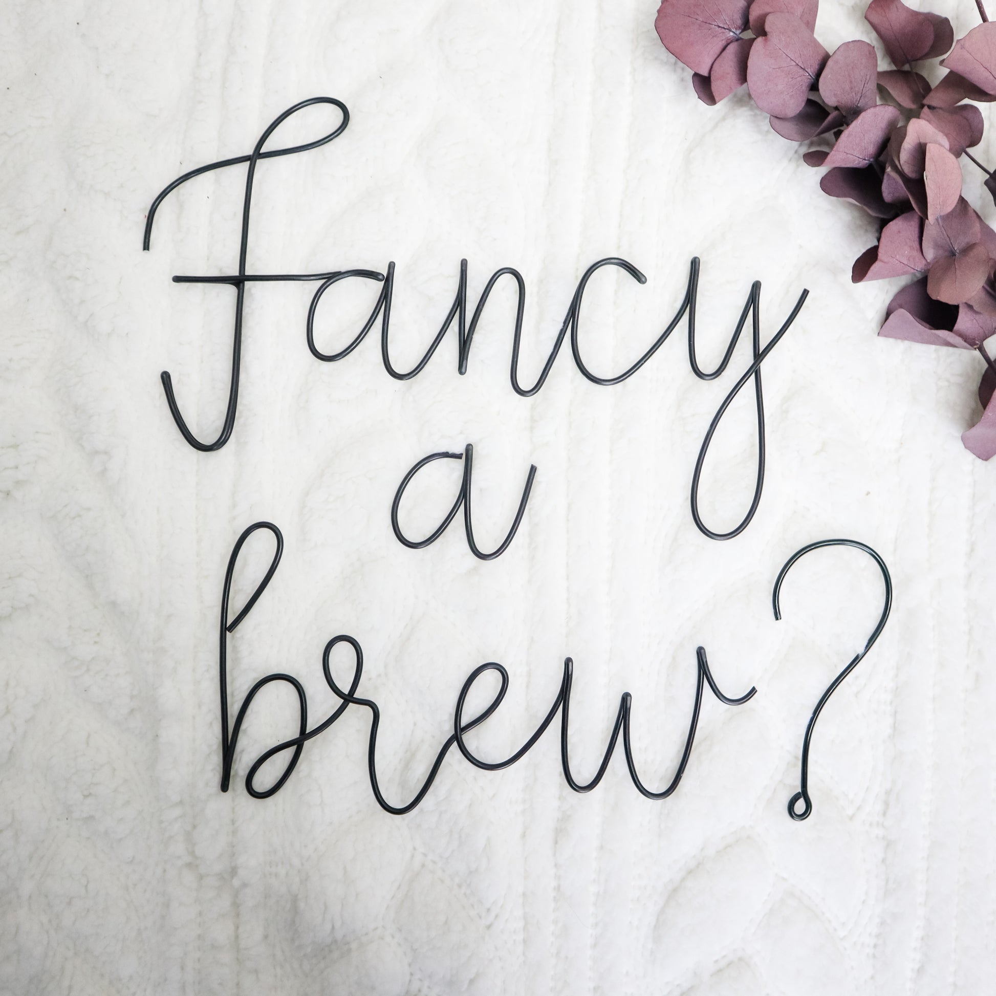 'Fancy a brew?' - the perfect sign for a kitchen or dining space. Handmade using 3mm aluminium wire and available in a selection of colours.