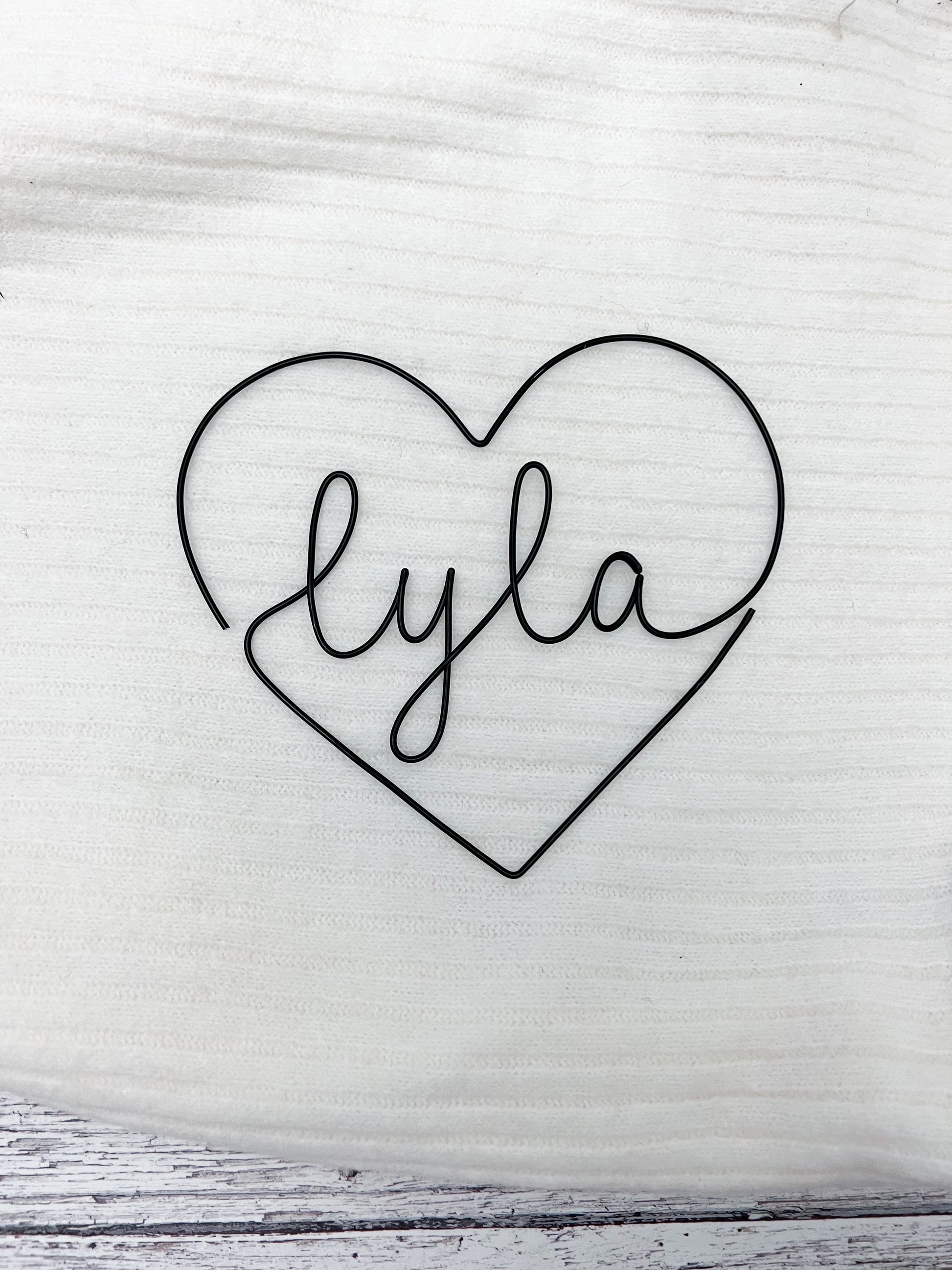 A beautiful personalised wire heart made with the name of your choice. Handmade using delicate 2mm aluminium wire, available in a variety of colours. Pictured in Copper and Black colour wire.